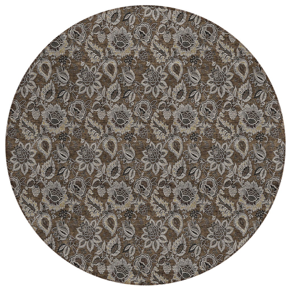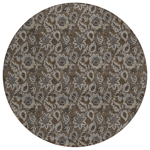 8' Chocolate And Charcoal Round Floral Washable Indoor Outdoor Area Rug