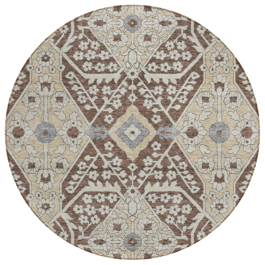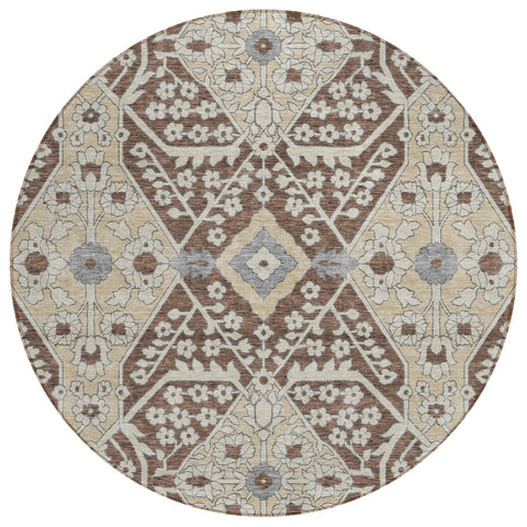 8' Chocolate Gray And Beige Round Floral Washable Indoor Outdoor Area Rug