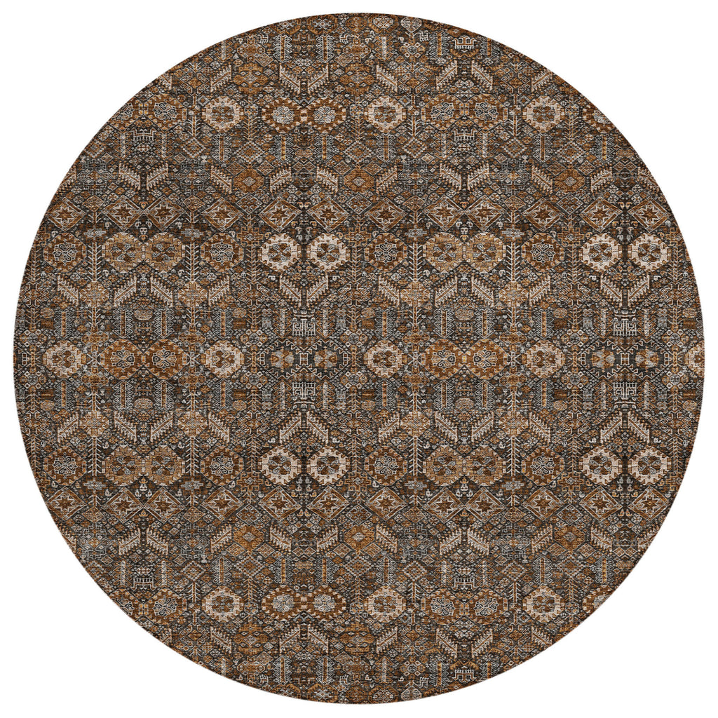 Set an inviting tone in your space with this 8-foot round chocolate round floral washable stain resistant non skid indoor outdoor area rug. This geometric round shaped rug features a floral pattern in chocolate that combines a good looking print with a unique and updated shape. The mix of shape, color, and design gives this rug refreshing visual interest. Ideal for spaces with kids and pets, this rug is stain resistant to help repel stains and spilled liquids. Area rugs help to give warmth and sense of home to your space. 96-inch H x 96-inch W x 0.19-inch D
