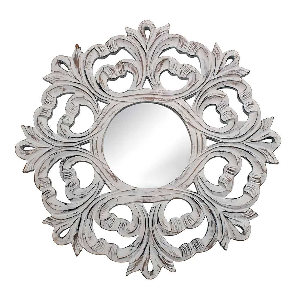 The elegantly crafted 24-inch white floral scrollwork distressed round framed accent mirror is what you need to add finishing touch to your decor. This round mirror is surrounded by beautiful carved floral cutout scrollwork that adds a nice touch of depth and texture. This finish is purposefully distressed and its rustic style makes this mirror a favorite for bringing some flair to your decor. This mirror will not only be a great practical addition to any location of your home but will also help elevate the space in the room. 23.6-inch H x 23.6-inch W x 0.7-inch D