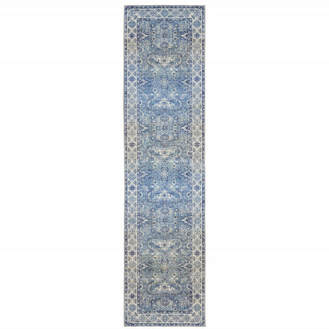 Add some artistry to your room with this 8-foot blue and gray oriental power loom runner rug. This runner shaped rug features a oriental design in blue and gray to give it visual interest. A classic shape marries with good looking design for your space ideal for spaces with kids and pets, this rug is stain resistant to help repel stains and spilled liquids. 24.02-inch H x 96.46-inch W x 0.11-inch D