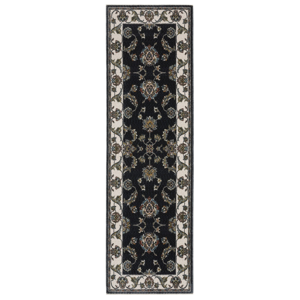 Add some artistry to your room with this 8-foot navy blue oriental power loom runner rug with fringe. This runner shaped rug features a oriental design in navy blue to give it visual interest. A classic shape marries with good looking design for your space ideal for spaces with kids and pets, this rug is stain resistant to help repel stains and spilled liquids. Tassel ends bring a timeless and fashionable look to your interior. Place this area rug against a hardwood or tile floor and it will enliven your living space with style and sophistication. 26.77-inch H x 92.52-inch W x 0.47-inch D