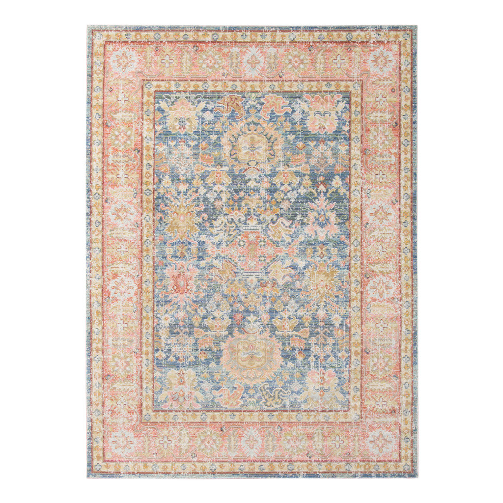 Set an inviting tone in your space with this 8-foot x 10-foot blue gold and orange floral area rug. Built to last, this rug crafted from polyester fibers is known for its durability and long lasting appeal. Rugs are a great way to showcase your style, hide imperfections, warm your home and reduce noise. This larger sized, traditional styled rug is ready to create a focal point or statement piece in your room. 94-inch h x 126-inch w x 0.08-inch d.