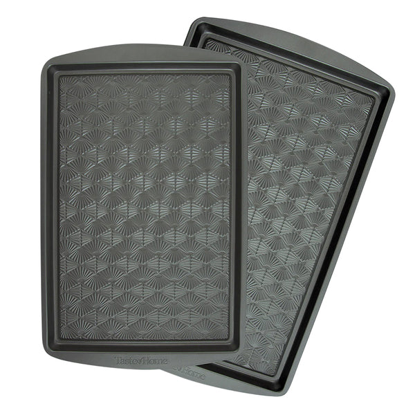 • Set consists of 2 baking sheets, one with 15 in. x 10 in. baking surface and one with 17 in. x 11 in. baking surface;• Made of durable, non-stick coated steel;• Suitable for all baking temperatures (not suitable for broiler); use of wood, rubber, or plastic tools is recommended;• Fast and even heat distribution ;• Embossed design strengthens baking sheets while increasing airflow for even baking ;• Non-stick coating ensures quick release and easy cleanup ;• Suitable for dishwasher; hand washing is recommended ;• PTFE-free;• Taste of Home(R) Test Kitchen approved;• 15 in. x 10 in. outer dimensions including handles and edge: 17.25 in. x 11.125 in. ;• 17 in. x 11 in. outer dimensions including handles and edge: 19.375 in. x 12 in.;