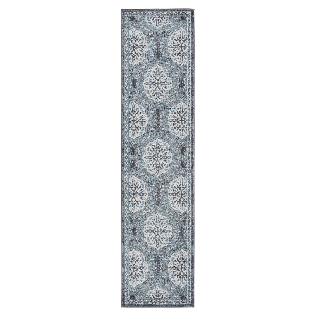 This 10-foot charcoal and ivory medallion power loom runner rug, is a great way to add warmth to a room. This runner shaped rug features a medallion design in charcoal and ivory to give it visual interest. A classic shape marries with good looking design for your space ideal for spaces with kids and pets, this rug is stain resistant to help repel stains and spilled liquids. Place this area rug against a hardwood or tile floor and it will enliven your living space with style and sophistication. 30-inch H x 123-inch W x 0.38-inch D