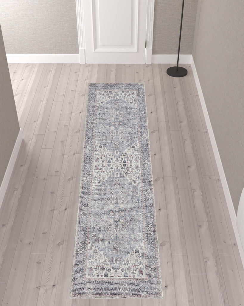 Add great coloration and comfortable texture to your space with this 10' gray floral power loom distressed washable runner rug. This runner shaped rug features a floral design in gray to give it visual interest. A classic shape marries with good looking design for your space This superior Turkish rug represents the highest quality and is built to last. Area Rugs help to give warmth and sense of home to your space. .28" H x 26.00" W x 120.00" D