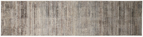 Set an inviting tone in your space with this 10' ivory gray and black abstract distressed runner rug with fringe. This runner shaped rug features a abstract design in ivory gray and black to give it visual interest. A classic shape marries with good looking design for your space This superior Turkish rug represents the highest quality and is built to last. Tassel ends bring a timeless and fashionable look to your interior. Place this area rug against a hardwood or tile floor and it will enliven your living space with style and sophistication. 0.39" H x 30" W x 120" D