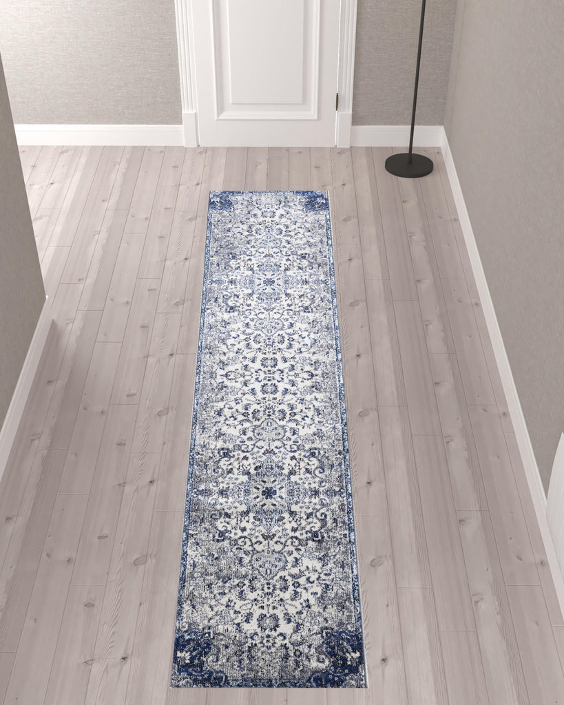 Add great coloration and comfortable texture to your space with this 10' ivory gray and blue floral power loom distressed stain resistant runner rug. This runner shaped rug features a floral design in ivory gray and blue to give it visual interest. A classic shape marries with good looking design for your space This superior Turkish rug represents the highest quality and is built to last. Ideal for spaces with kids and pets, this rug is stain resistant to help repel stains and spilled liquids. Place this area rug against a hardwood or tile floor and it will enliven your living space with style and sophistication. 0.39" H x 24" W x 120" D