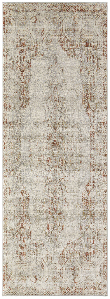 This 10-foot ivory gray and brown abstract power loom worn faded runner rug with fringe, is a great way to add warmth to a room. This runner shaped rug features a abstract design in ivory gray and brown to give it visual interest. A classic shape marries with good looking design for your space tassel ends bring a timeless and fashionable look to your interior. Place this area rug against a hardwood or tile floor and it will enliven your living space with style and sophistication. 30-inch H x 120-inch W x 0.39-inch D