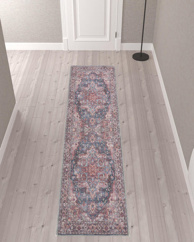 This 10' red floral power loom distressed washable runner rug, is a great way to add warmth to a room. This runner shaped rug features a floral design in red to give it visual interest. A classic shape marries with good looking design for your space This superior Turkish rug represents the highest quality and is built to last. Area Rugs help to give warmth and sense of home to your space. .28" H x 26.00" W x 120.00" D