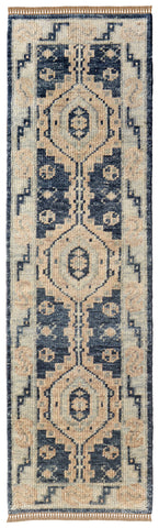 Add great coloration and comfortable texture to your space with this 12-foot blue and ivory wool geometric hand knotted runner rug with fringe. This runner shaped rug features a geometric design in blue and ivory to give it visual interest. A classic shape marries with good looking design for your space ideal for spaces with kids and pets, this rug is stain resistant to help repel stains and spilled liquids. Tassel ends bring a timeless and fashionable look to your interior. Crafted by skilled artisans, this hand knotted rug is genuine and unique. No two will be exactly alike. Place this area rug against a hardwood or tile floor and it will enliven your living space with style and sophistication. 30-inch H x 144-inch W x 0.4-inch D