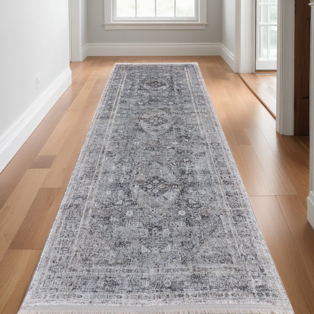 This 12-foot gray and silver oriental power loom worn faded runner rug, is a great way to add warmth to a room. This runner shaped rug features a oriental design in gray and silver to give it visual interest. A classic shape marries with good looking design for your space area rugs help to give warmth and sense of home to your space. 32-inch H x 144-inch W x 0.22-inch D