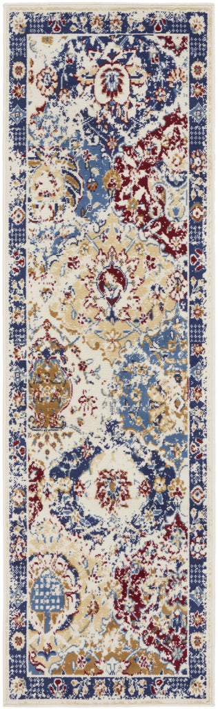 This 12-foot ivory red and blue ogee distressed runner rug, is a great way to add warmth to a room. Ideal for spaces with kids and pets, this rug is stain resistant to help repel dirt and spilled liquids. Built to last, this rug crafted from polypropylene fibers is known for its durability and long lasting appeal. Rugs are a great way to showcase your style, hide imperfections, warm your home and reduce noise. This rectangular shaped rug features a abstract design that will add a functional and decorative accent to your space. This bohemian styled runners makes a great accent for the hallway, in front of cabinets, in the laundry room, or any other space you need a narrow and long rug. 27-inch h x 144-inch w x 0.5-inch d