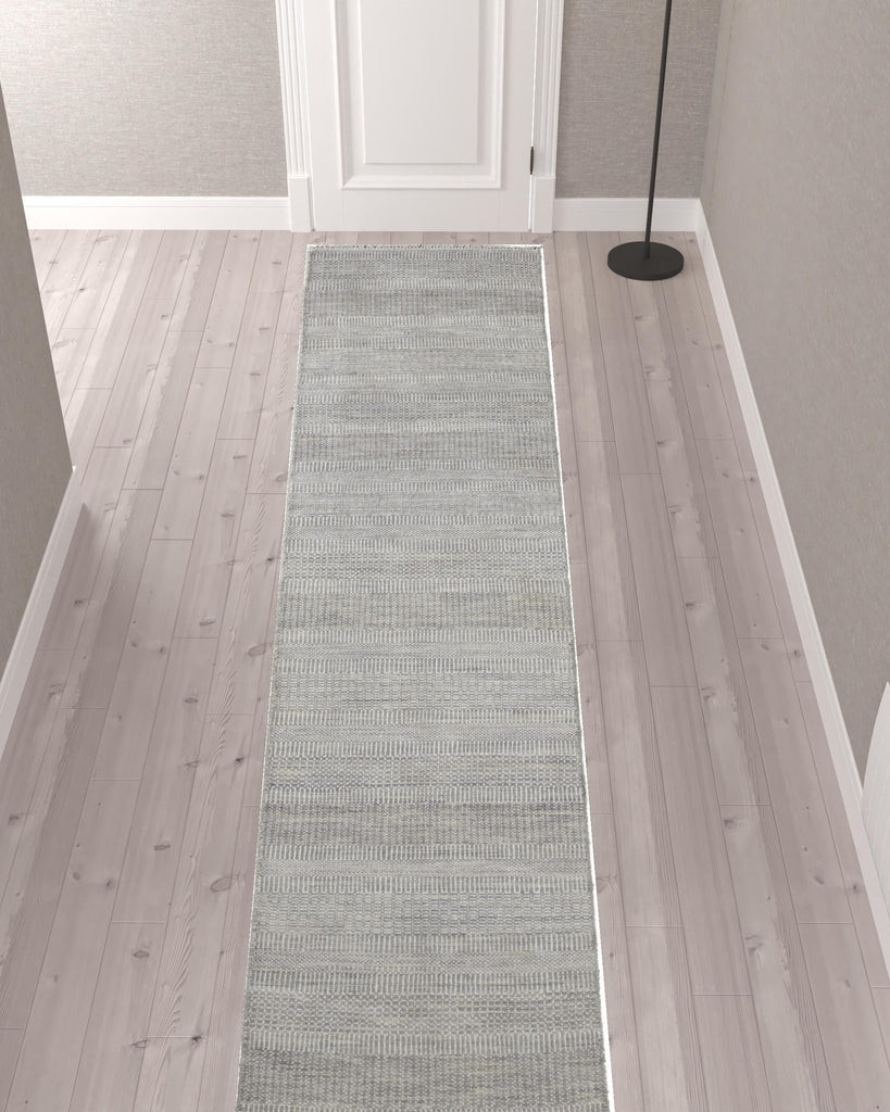 Add great coloration and comfortable texture to your space with this 12' silver wool striped hand knotted runner rug. This runner shaped rug features a striped design in silver to give it visual interest. A classic shape marries with good looking design for your space Crafted by skilled artisans, this hand knotted rug is genuine and unique. No two will be exactly alike. Place this area rug against a hardwood or tile floor and it will enliven your living space with style and sophistication. 1" H x 30" W x 144" D