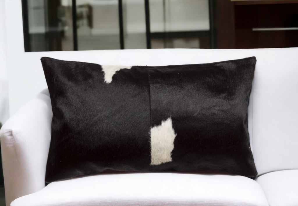 This 12-inch x 20-inch black and white cowhide throw pillow will add a beautiful decorative accent to your decor. The luxurious black and white coloring of the genuine cowhide will add dimension and texture to your space. Elegantly chic, this pillow is the epitome of luxury. This soft cotton pillow not only is decorative but made to be comfy and cozy all day long. For anyone that loves to decorate or accent their space with color and texture. Decorative pillows are a great way to change up the look and feel of your space easily and quickly. 12-inch H x 20-inch W x 5-inch D
