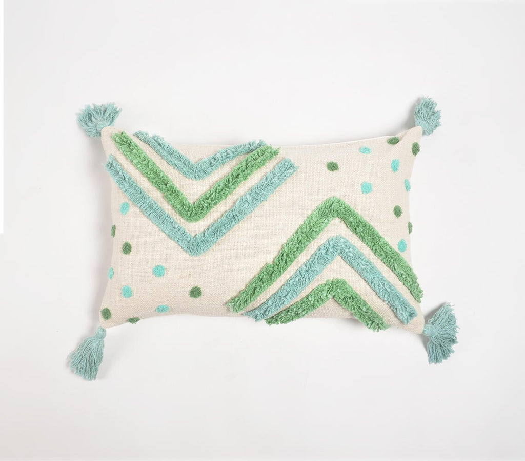 12" X 20" Blue and Green Chevron Cotton Throw Pillow Cover With Tassels, Tufts