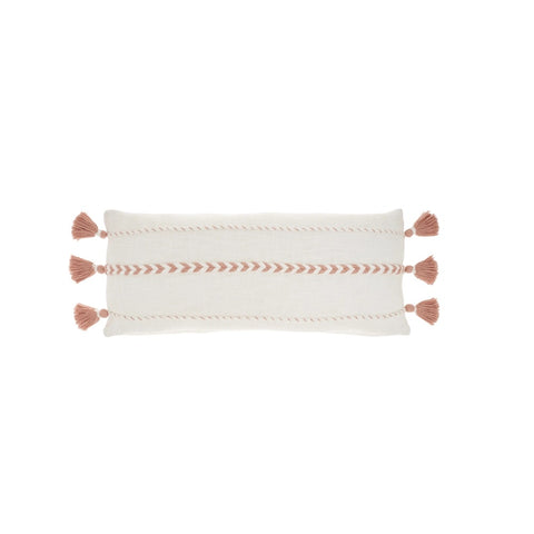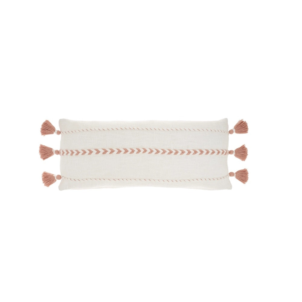 Unique and decorative, this comfortable 12-inch x 30-inch pink and white striped cotton throw pillow with tassels will leave a lasting impression. This soft and durable decorative pillow is expertly made of high grade, long lasting cotton in a pink and white coloration. Fun and decorative tassels add some high end and hand-crafted textural designer touches. This soft polyester filled pillow not only is decorative but made to be comfy and cozy all day long. Decorative throw pillows not only add color and dimension to your space but can be comfy and supportive when you are lounging and cuddling as well. Decorative pillows are a great way to change up the look and feel of your space easily and quickly. 12-inch H x 30-inch W x 5-inch D