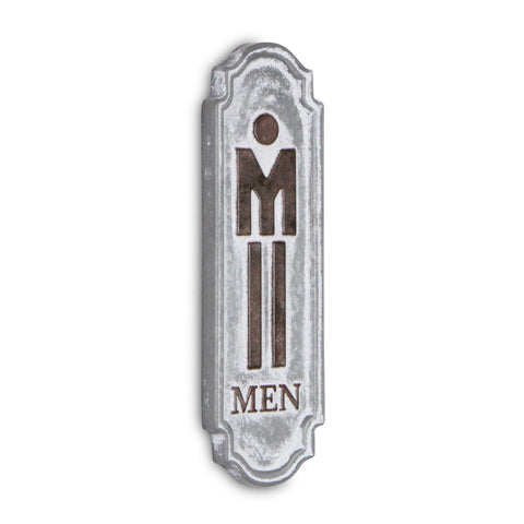 The 12-inch x 4-inch gray metal men's room wall decor is the perfect way to mark your bathroom. Add outside the door to your bathroom to add a rustic and decorative touch. Hangs vertically to advertise the preferred sex for the particular washroom. 12-inch H x 4-inch W x 0.5-inch D