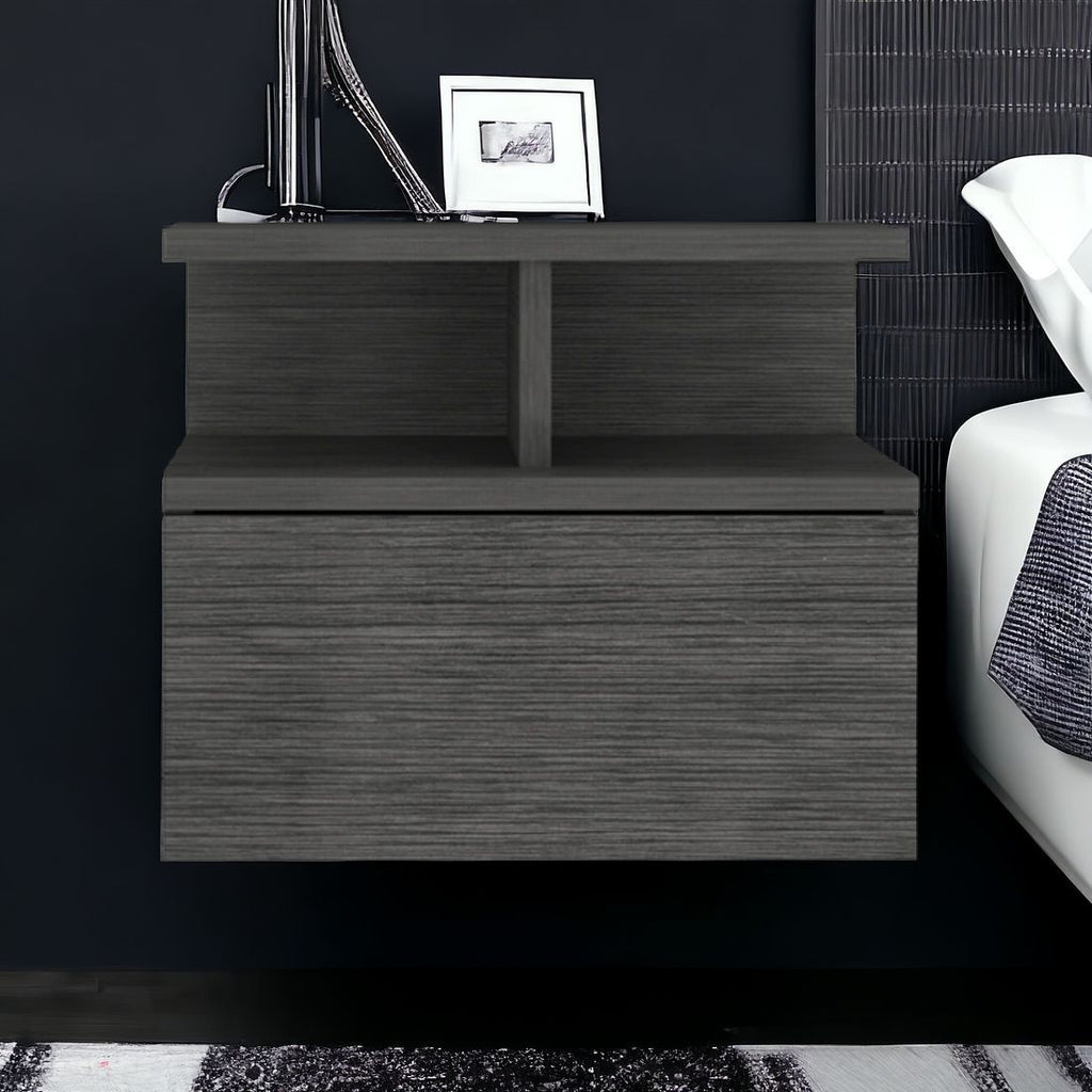 Good looking design and practical styling meet to form this 13-inch dark gray wood one drawer floating nightstand. Maximize your floor space and adjust to the exact height you need, when you add this wall-mounted design to your space. Sturdy and durable construction from manufactured wood ensures this trusty bedside table is built to last. The easy open drawer allows you hidden storage to keep your essentials close at hand. 2 shelves are included for you to have additional storage and display space. The unsung hero of the bedroom, this nightstand is perfect for keeping a glass of water, lamp, alarm clock, jewelry, and more, close by and easily accessible. 13-inch h x 14.01-inch w x 12-inch d.