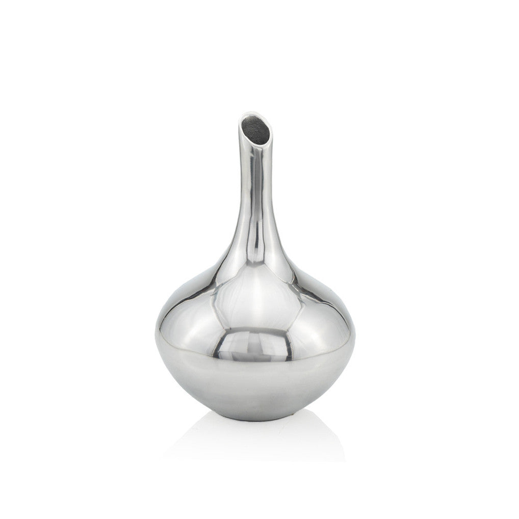 Add a touch of contemporary elegance to your home decor with this 13-inch silver bud aluminum table vase. The unique bud shape and sleek silver color make it a standout piece for any tabletop display. Crafted from aluminum, this vase exudes a modern and sophisticated style that will complement a variety of interior design themes. Display it on its own or fill it with your favorite fresh blooms to create a stunning centerpiece for your dining table or mantel. Whether used as a standalone decor piece or as a functional vase, this stylish and versatile accessory is sure to enhance the look of any room. 12.5-inch h x 8-inch w x 8-inch d.