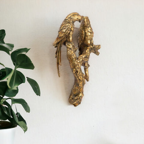 Unique and decorative, this 13-inch antiqued gold parrots hanging dimensional sculpture will leave a lasting impression. Lend a tropical touch to your interior d��cor with this lovely sculpture, which displays the fine detailing of two lovely parrots perched atop a gnarly branch of an old tree, with a gleaming antiqued gold finish. The impressive design and rich coloring of this unique sculpture make it a perfect piece of d��cor for your sunroom, living room, or entryway. 13-inch h x 10.2-inch w x 3.5-inch d.
