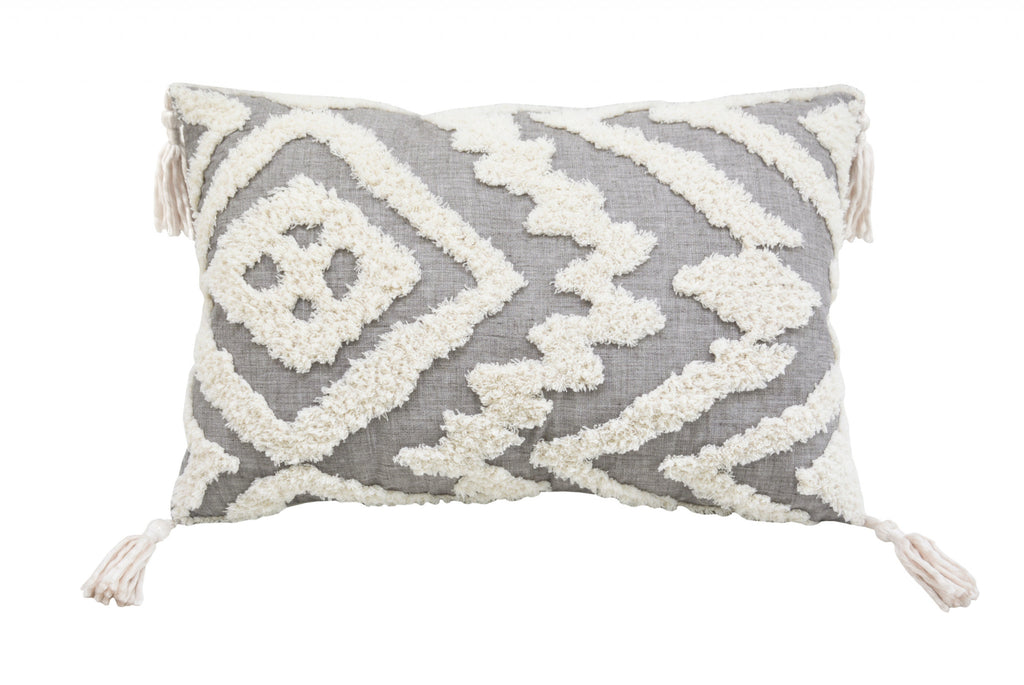 Bring a bit of fashion and zip to your space with this eye-catching and comfy 13-inch x 20-inch gray and white throw pillow with tassels. This soft and durable decorative pillow is expertly made of high grade, long lasting polyester in a gray and white coloration. Charming decorative tassels give this design texture along with a hand-crafted look and feel. This soft polyester filled pillow not only is decorative but made to be comfy and cozy all day long. Decorative pillows are a great way to change up the look and feel of your space easily and quickly. A great decorative accessory to add color and dimension to your favorite chair, accent your sofa, or to use as part of your bed ensemble. 13-inch h x 20-inch w x 4-inch d.