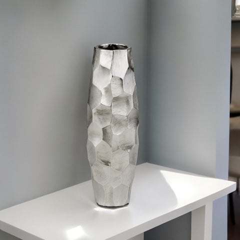 Elevate your space with the 14-inch aluminum silver cylinder table vase, a sleek addition to any room. Its modern style, rough hewn faceted geometric carvings, and cylindrical shape exude contemporary elegance, while the silver aluminum material brings a touch of sophistication to your decor. Perfect for tabletop display, this vase is a versatile piece that can complement a variety of design aesthetics. Add fresh flowers or faux botanicals to enhance its beauty and create a striking focal point in your home. Embrace the minimalist charm of this stylish vase and effortlessly elevate your interior styling with a touch of modern flair. 14-inch H x 4-inch W x 4-inch D