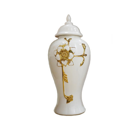 Elevate your space with the 14-inch white and gold floral urn ceramic ginger jar with sculptural details, a stylish addition to your contemporary decor. Popular with interior designers, the ginger jar is a timeless and versatile statement piece that can be used as a vase, table centerpiece, storage vessel, or general decorative accent. Inspired by old world oriental design, this regal accent will add chic artistic flair to your living room, bedroom, entryway or dining area. Crafted from high quality ceramic, this exquisite ginger jar exudes sophistication and timeless beauty. 13.5-inch H x 6-inch W x 6-inch D