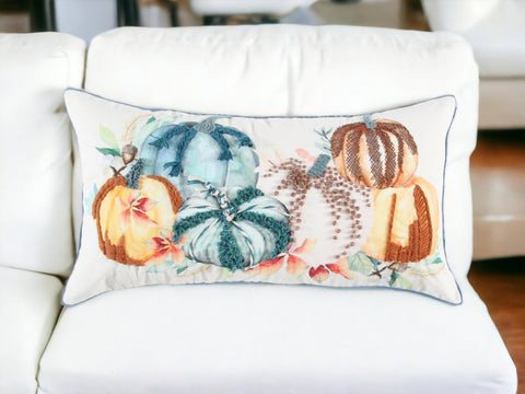 Set a festive fall mood with this cozy and fun 14-inch x 14-inch blue and white thanksgiving cotton pillow with embroidery edges. This super soft decorative pillow is expertly made of high grade, long lasting 100% cotton in a blue and white coloration. Super soft and built to hold its shape, this polyester pillow is a great option. For anyone that loves to decorate or accent their space with color and texture. A great decorative accessory for your favorite chair, to accent your sofa, or to use as part of your bed ensemble. 14-inch H x 14-inch W x 6.25-inch D