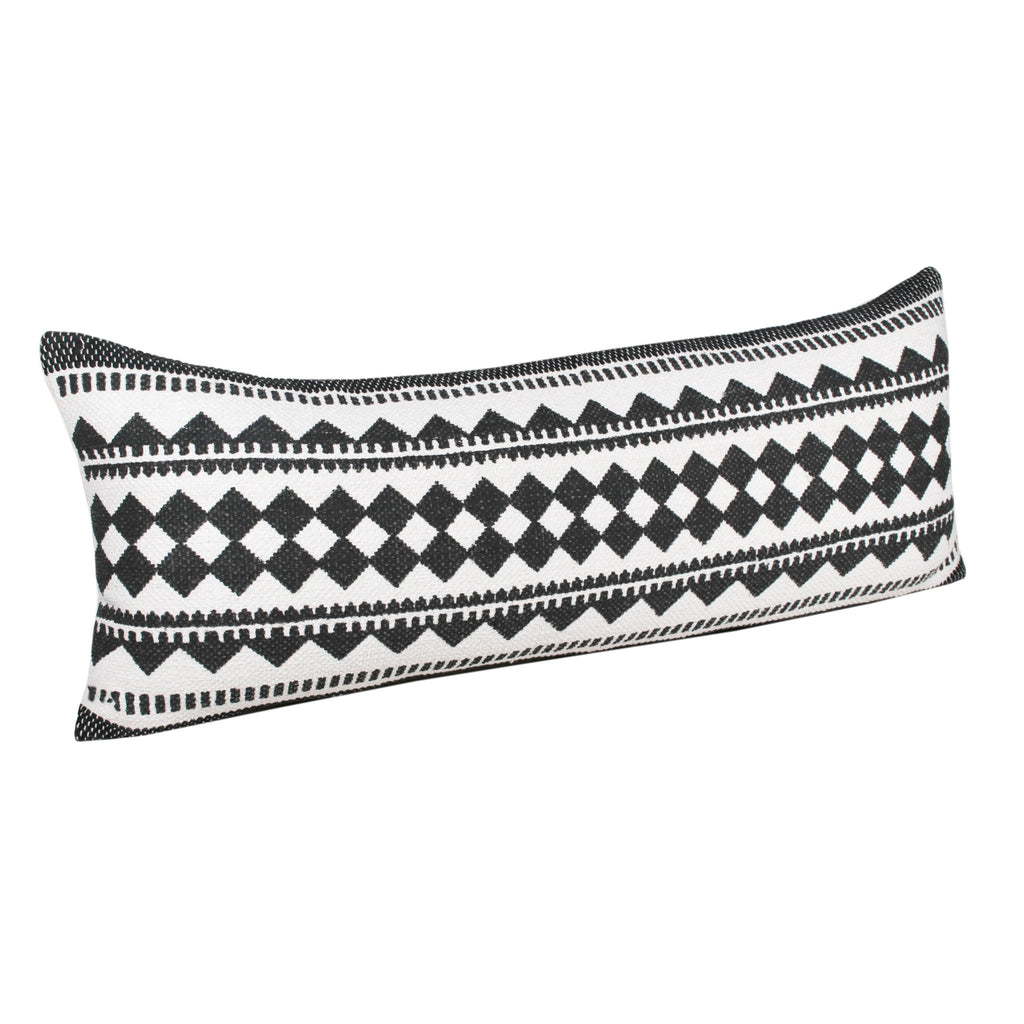Bring a bit of fashion and zip to your space with this eye-catching and comfy 14" x 36" black and white 100% cotton geometric zippered pillow. Soft and textural black and white 100% cotton has been used to make this pillow look and feel like a real treasure. Great to use on its own or mix with other decorations for the perfect look. A great decorative accessory for your favorite chair, to accent your sofa, or to use as part of your bed ensemble. 14" H x 14" W x 36" D