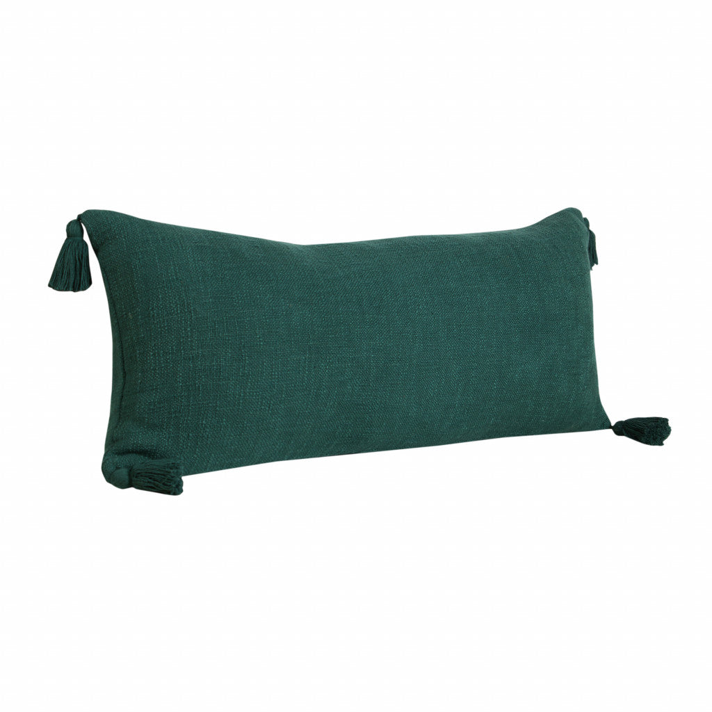 The 14-inch x 36-inch emerald cotton throw pillow with tassels is the perfect decorative accessory for your home. This soft and durable decorative pillow is expertly made of high grade, long lasting cotton in a emerald coloration. Fun and decorative tassels add some high end and hand-crafted textural designer touches. This soft polyfill filled pillow not only is decorative but made to be comfy and cozy all day long. Great to use on its own or mix with other decorations for the perfect look. A great decorative accessory to add color and dimension to your favorite chair, accent your sofa, or to use as part of your bed ensemble. 14-inch h x 36-inch w x 7.5-inch d.