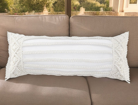 Bring a bit of fashion and zip to your space with this eye-catching and comfy 14-inch x 36-inch white textured indoor outdoor throw pillow with fringe. Durable and easy to care for this pillow is designed to withstand the elements and still look great. This hand-crafted pillow features textural tone-on-tone macrame for a great look. 14-inch H x 36-inch W x 7.5-inch D