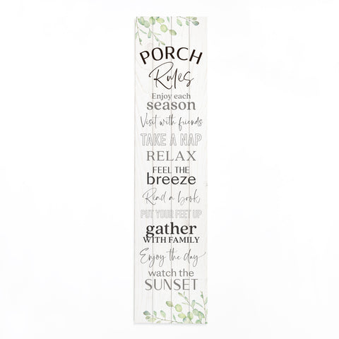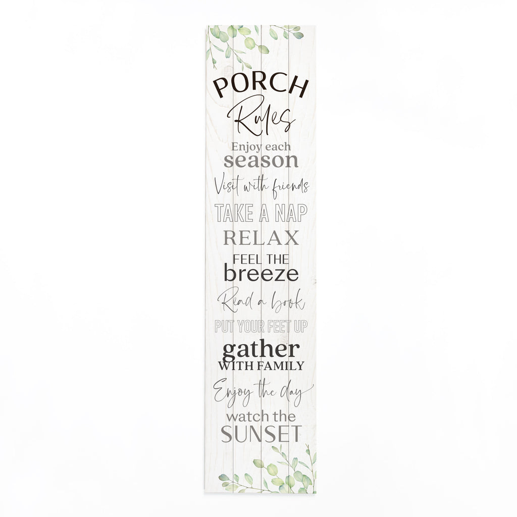 Add an air of fashion to your room and rejuvenate the space with this 14-inch x 60-inch black and white porch rules solid wood wall decor. Instantly liven up your space with this art that brings color and dimension to your walls. This good looking decor will fill the empty space on your wall while adding a stylish and decorative touch. Utilize this opportunity to create a focal point in the room with this fabulous wall decor option. 60-inch h x 14-inch w x 0.75-inch d