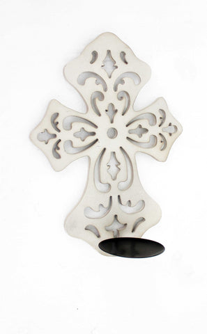 Traditional wooden cross detailed with inspiring floral carvings, this candle holder sconce is perfectly crafted to be a great addition to any existing fixtures in the home. The holy cross shaped candle holder sconce will also definitely outline your place of worship with a touch of spirituality. Above all, our wooden candle holder sconce brings overwhelming peace and beauty to the living room, hallway, or meditation room. - Traditional collection - Cross shaped - White finish - Metal candle holder