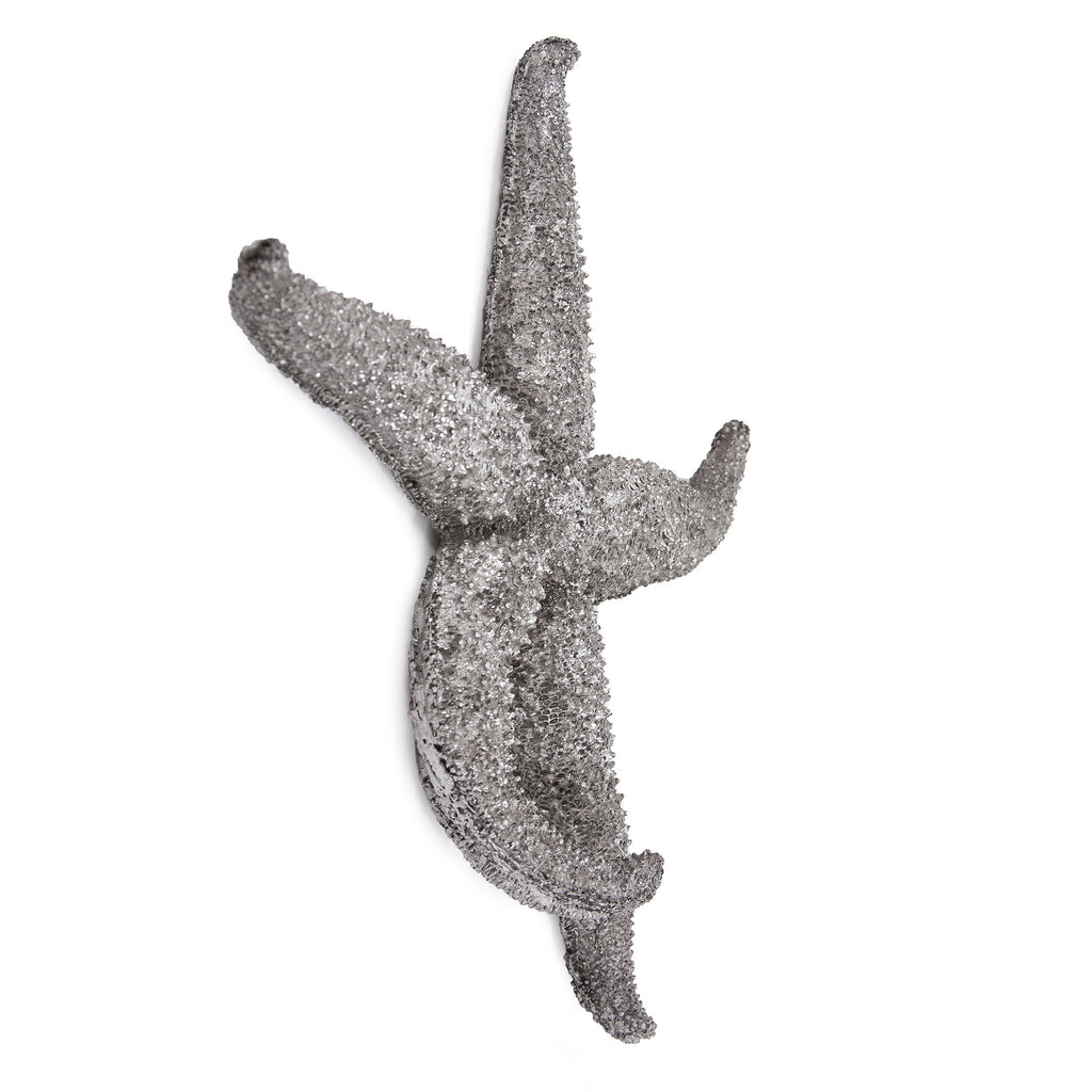Bring the splendor of the sea into your space with the mesmerizing antiqued silver colored resin starfish hanging dimensional wall decor. Update your walls with this great tropical sea life dimensional wall sculpture. This piece features a stunning starfish design that embodies the essence of coastal living. Crafted from durable resin that is sculpted and textural, it offers both beauty and longevity. 15-inch h x 16-inch w x 2-inch d.