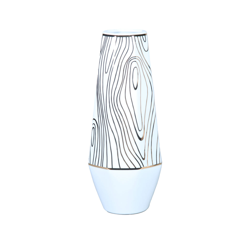 Elevate your space with this stunning 15-inch white and gold faux bois ceramic table vase, showcasing a sleek cylinder shape that exudes a contemporary charm. Crafted from high-quality ceramic, this vase features a sophisticated color combination of white and gold, adding a touch of elegance to any room. The unique design of this table vase makes it a versatile decor piece that effortlessly complements modern interiors. Its striking silhouette and stylish finish make it a must-have for those seeking a modern and sophisticated aesthetic in their home. 15-inch H x 6.5-inch W x 6.5-inch D
