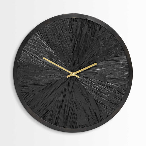 Beautiful modern style clock that will complete your setting. Designed with a black ebony tone face with antique gold hands, this clock makes a unique statement in your home. There are no numerical markings just for fun and thought provoking definition. Add this clock to your home set for a unique touch in your decor. It comes with a lovely black finish. Dimensions: 16.5".