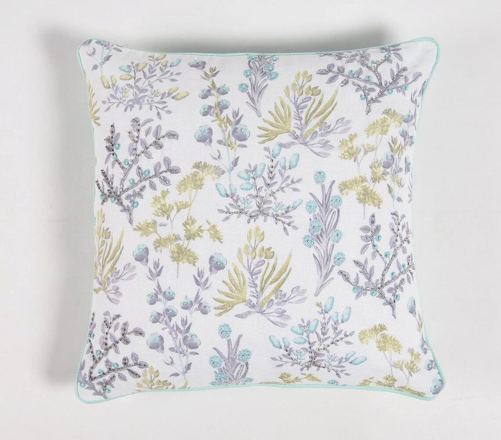 Unique and decorative, this comfortable 16-inch blue and white botanical cotton throw pillow cover with beads will leave a lasting impression. This blue and white hued, accent pillow cover, represents quality construction, expertly made from durable cotton that is not only long lasting but soft to the touch as well. Great to use on its own or mix with other decorations for the perfect look. Decorative pillows are a great way to change up the look and feel of your space easily and quickly. 16-inch H x 16-inch W x 0.1-inch D
