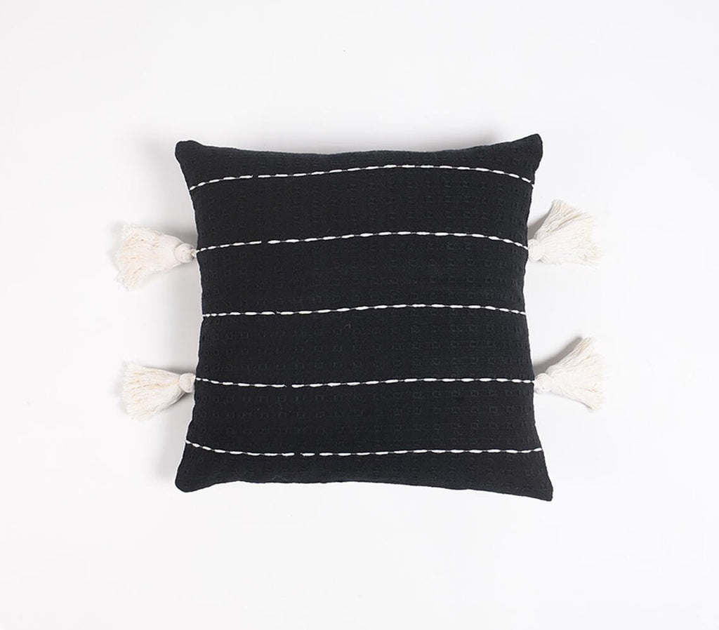 This 16-inch gray and white striped cotton throw pillow cover with embroidery, tassels will add a beautiful decorative accent to your decor. This soft and durable decorative pillow cover is expertly made of high grade, long lasting cotton in a gray and white coloration. For anyone that loves to decorate or accent their space with color and texture. Decorative pillows are a great way to change up the look and feel of your space easily and quickly. 16-inch H x 16-inch W x 0.1-inch D