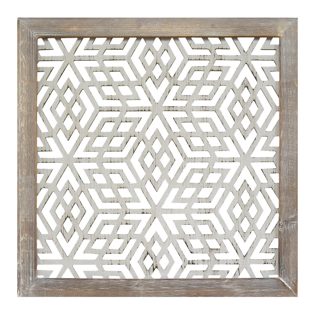 This 16-inch x 16-inch gray and white abstract geometric wood and metal wall decor will add a beautiful decorative accent to your decor. With materials and a finish that is purposefully distressed, this hanging wall decor will instantly liven things up and bring color and dimension to your walls. 16-inch H x 16-inch W x 2-inch D