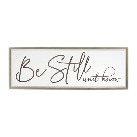 Add an air of fashion to your room and rejuvenate the space with this 16-inch x 45-inch brown and white be still and know solid wood wall decor. Our words matter. Instantly liven up your space with this sentimental text decor. With materials and a finish that is purposefully distressed, this hanging wall decor will instantly liven things up and bring color and dimension to your walls. 16-inch h x 45-inch w x 0.75-inch d.