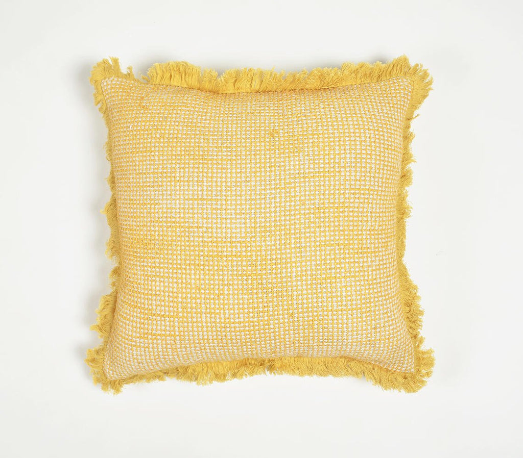 The 16-inch yellow and white check cotton throw pillow cover with fringe is the perfect decorative accessory for your home. This yellow and white colored decorative pillow cover is made from high grade cotton that is durable and long lasting. Charming decorative fringe give this design texture along with a hand-crafted look and feel. For anyone that loves to decorate or accent their space with color and texture. A great decorative accessory for your favorite chair, to accent your sofa, or to use as part of your bed ensemble. 16-inch H x 16-inch W x 0.1-inch D