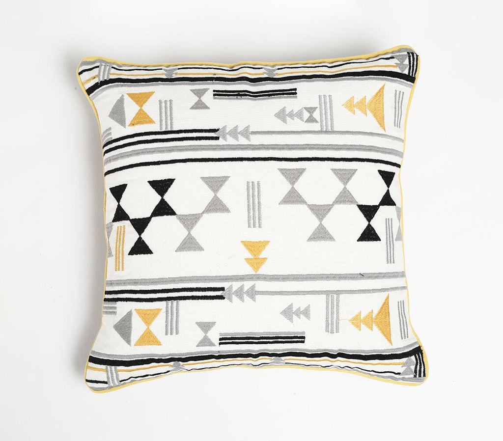 The 16-inch yellow and white geometric cotton throw pillow cover with embroidery is the perfect decorative accessory for your home. The yellow and white coloring of the extremely durable and long lasting cotton pillow cover will add dimension and texture to your space. Great to use on its own or mix with other decorations for the perfect look. Decorative pillows are a great way to change up the look and feel of your space easily and quickly. 16-inch H x 16-inch W x 0.1-inch D