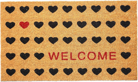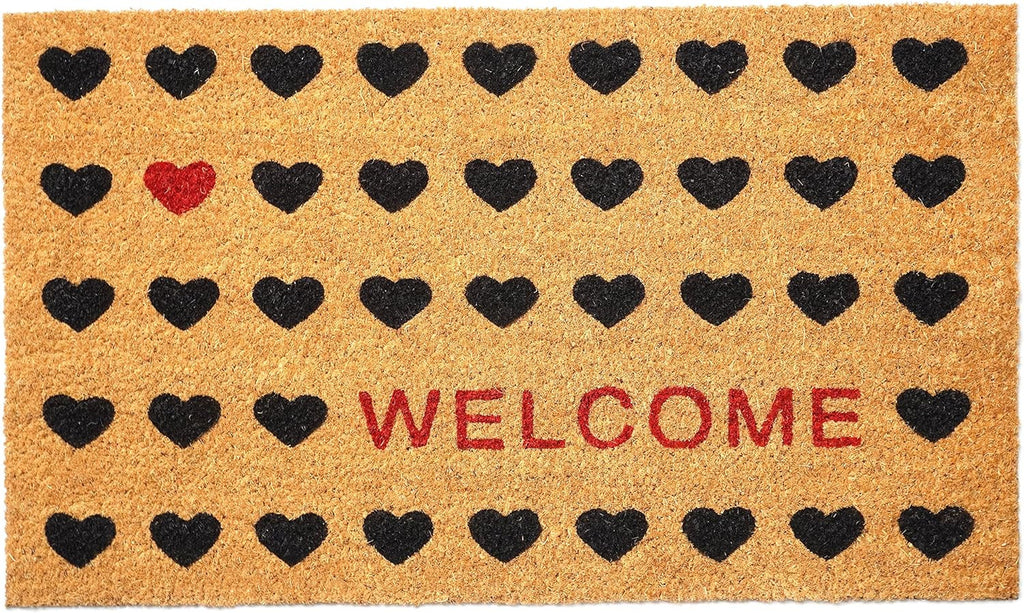 Known for it's extreme durability and ability to withstand heavy foot traffic, this 17-inch x 29-inch natural and black coir heart welcome outdoor valentine's day door mat is an ideal option for the front door or entrance way of your home or business. Crafted from coconut husks, this mat is not only functional but is an an eco-friendly and visually appealing accessory. The naturally bristled texture of coir is an efficient way to clean dirt and mud from shoes and is easy to clean and maintain. Add this festive and decorative valentine's day mat to create a practical yet inviting welcome to all who enter. 17-inch H x 29-inch W x 0.6-inch D