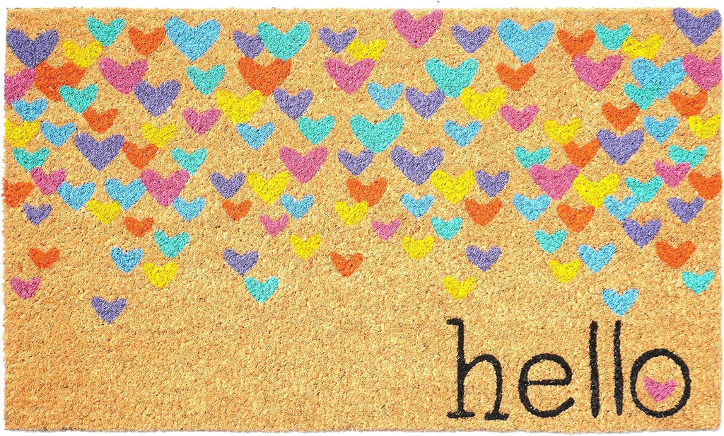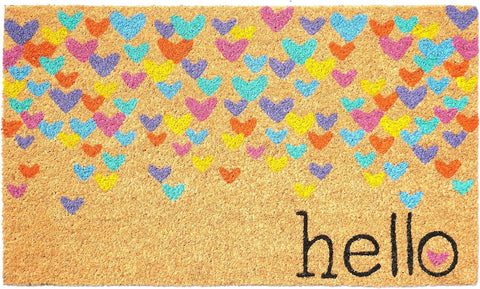 Known for it's extreme durability and ability to withstand heavy foot traffic, this 17-inch x 29-inch natural blue and yellow coir heart outdoor valentine's day door mat is an ideal option for the front door or entrance way of your home or business. Crafted from coconut husks, this mat is not only functional but is an an eco-friendly and visually appealing accessory. The naturally bristled texture of coir is an efficient way to clean dirt and mud from shoes and is easy to clean and maintain. Add this festive and decorative valentine's day mat to create a practical yet inviting welcome to all who enter. 17-inch H x 29-inch W x 0.6-inch D