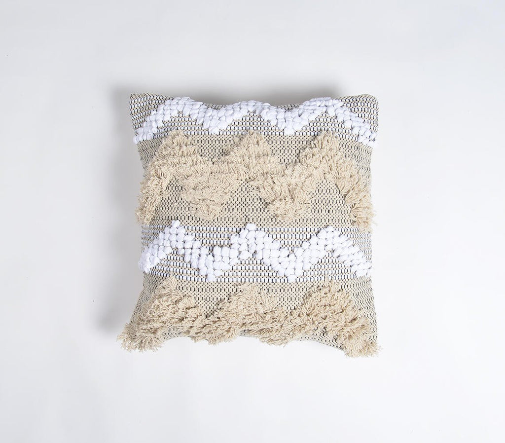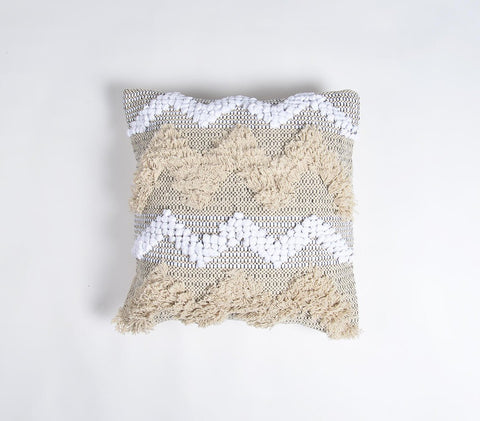 The perfect complement to your sofa, favorite chair, or bed, this 18-inch beige and white chevron cotton throw pillow cover with fringe, tufts is a great decorative accent. This soft and durable decorative pillow cover is expertly made of high grade, long lasting cotton in a beige and white coloration. Decorative throw pillows not only add color and dimension to your space but can be comfy and supportive when you are lounging and cuddling as well. Decorative pillows are a great way to change up the look and feel of your space easily and quickly. 18-inch H x 18-inch W x 0.1-inch D