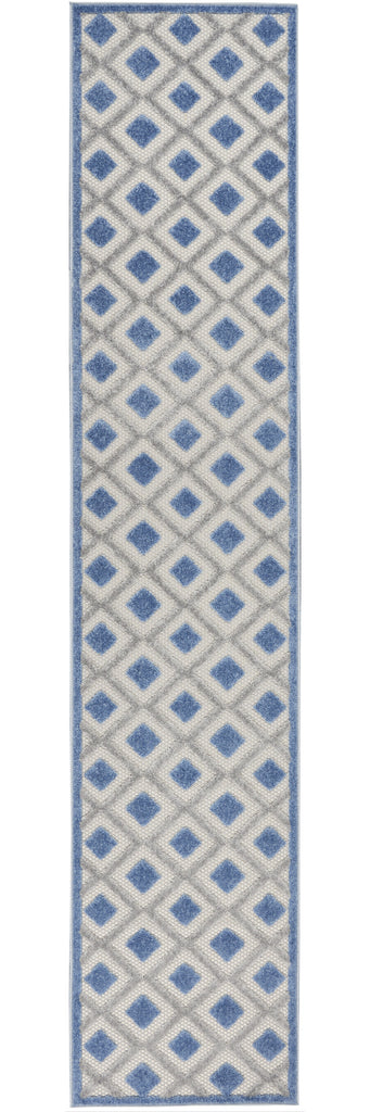 Add some artistry to your room with this 12-foot blue and gray indoor outdoor runner rug. Versatile in use, durable, and easy to maintain, this rug is an ideal solution to add a decorative and inviting touch to your indoor or outdoor space. Crafted through machine-made construction, this rug ensures lasting quality and resilience. The sleek runner shape makes it perfect for hallways or narrow spaces, enhancing the visual appeal with its stylish color palette of blue and gray. 27-inch h x 144-inch w x 0.25-inch d.