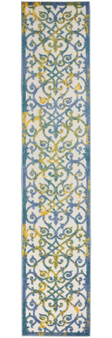 Add great coloration and comfortable texture to your space with this 12-foot ivory and blue indoor outdoor area rug. Makes a great way to dress up your patio, porch, or poolside, but also works well as a durable and easy to maintain option in the kitchen, family room, or mudroom. Crafted using machine-made techniques, this stylish rectangular rug offers a seamless blend of aesthetics and functionality, perfect for enhancing any outdoor or indoor environment. Its vibrant colors bring life to your decor while providing long-lasting wear and easy upkeep. 27-inch h x 144-inch w x 0.25-inch d.